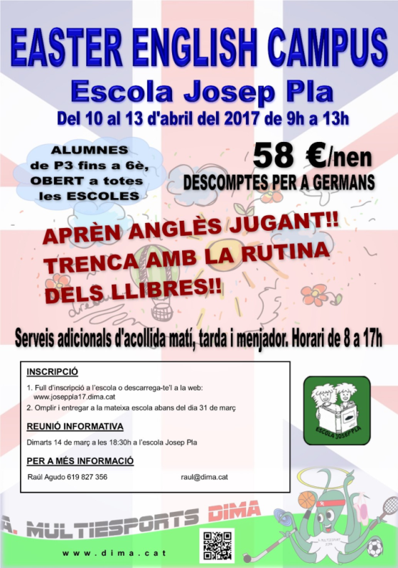 Benvinguts a l'àrea privada del Casal de Setmana Santa 2017 de l'escola Josep Pla i l'Associació Multiesports Dima.